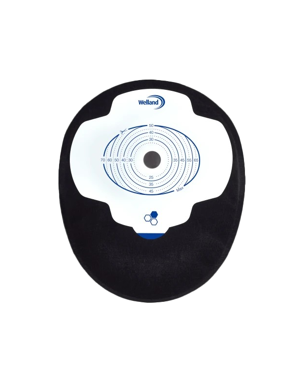1-delt system. Sort pose med inspeksjonsvindu. Platen består av Manuka honning og hudvennlig Hyperflex hydrocolloid, og er designet for konturer og fleksibilitet.
